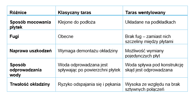 Między tarasem podniesionymi klasyczną konstrukcją występują liczne różnice zarówno na etapie wykonania, jak i podczas ich użytkowania. Najważniejsze z nich prezentuje poniższa tabela.